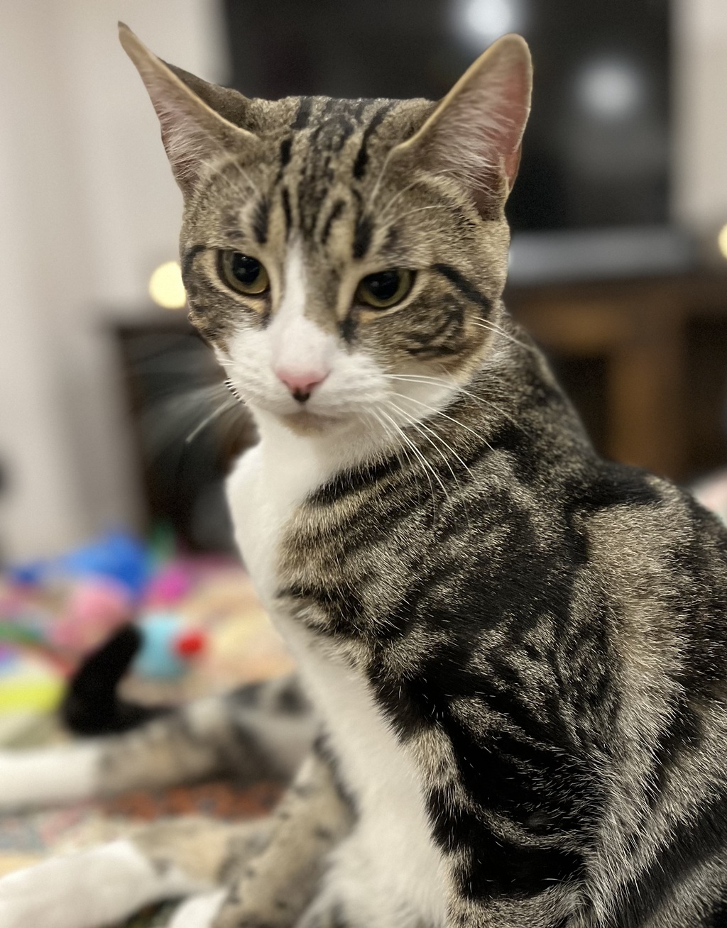 His sensitive side shines when he's spoilt with cuddles, he loves meeting other young friendly cats and kittens, so would be good in a home with another sibling and hopefully a big window to sit in the sun and keep an eye on the outdoor activities. Looking to make this handsome boy your very own - apply now.