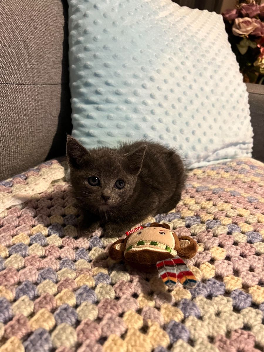 Hannah is a 6-week old Russian Blue X who is ready to join her forever family in just a few weeks. She is a very sweet natured and loving cat who loves to play and be part of a family. Her gentle nature makes her perfect for families with other cats, as she gets along great with her feline friends. Hannah will require an approved holding deposit before adoption, and more information can be obtained by emailing carolangelsrescue@gmail.com.