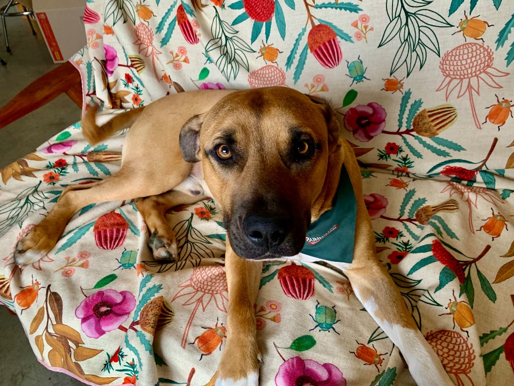 He is curious about cats, and plays well with other dogs. He is also good with children - but we reckon 5yrs+ as he can be a bit of a boof-head and could accidentally knock over smaller children.