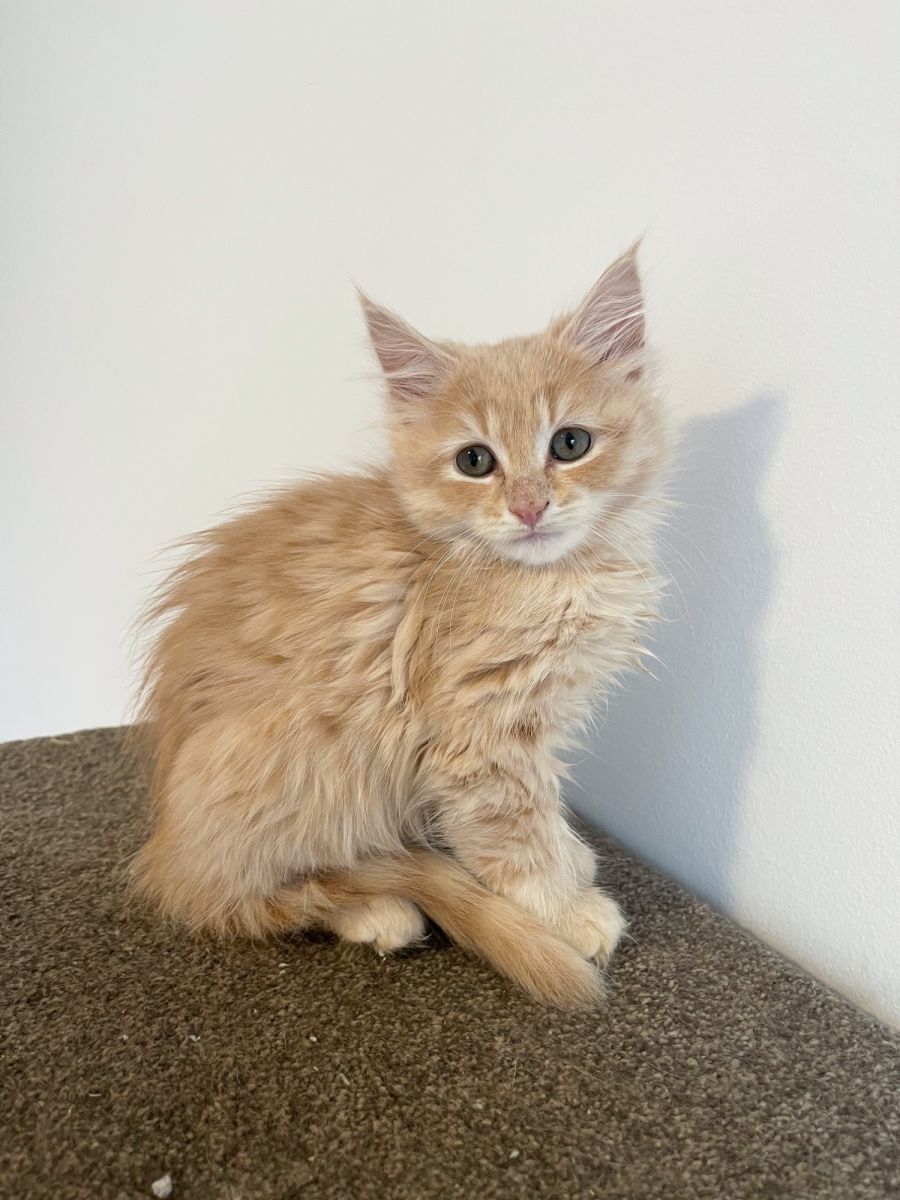 This sweet kitty is a little on the shy side when you first meet her, but don't let that fool you; she loves to play and have fun. She loves chasing her siblings around the house, wrestling, and climbing to the top of her cat tree. For those moments when she wants some alone time, Daffodil loves to hide in boxes or simply just lounge around.