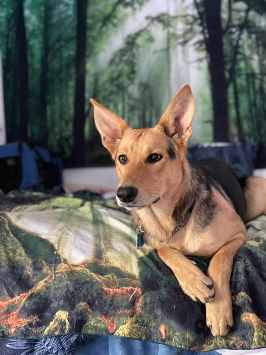 I am ❤️🔥 Zia and I'm a German Sheperd x. Even though I am a young baby at 6 months old, I know all my basic training commands. I love people and even cats too! I am fostered with foster cats and a Collie x dog who is so nice to me. We play gentle and she lets me share the bed at night when we go inside.