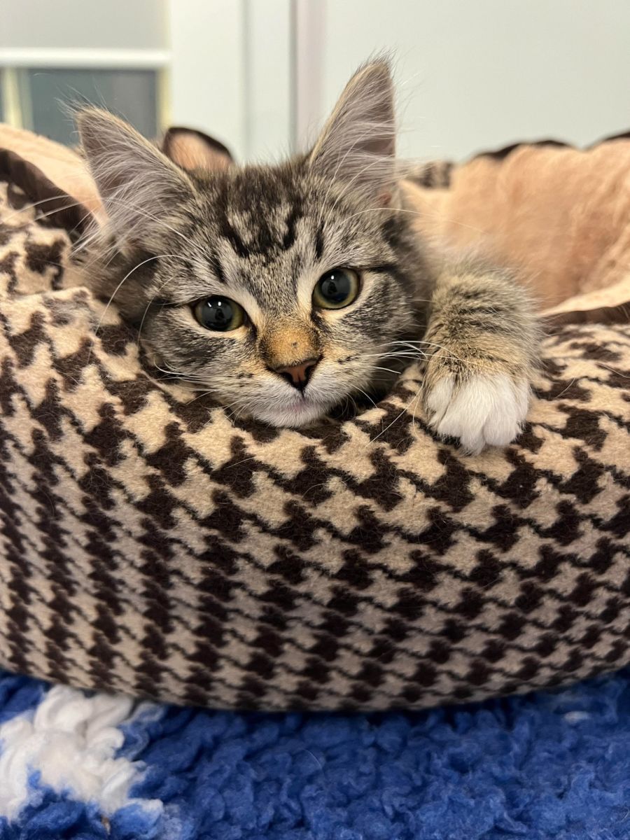 Meet Stripe! While she may be a bit shy at first, once you give her some time to settle in, she'll shower you with love and affection. This sweet feline absolutely adores cuddling and will happily bump you and curl up in your lap for hours. She loves the gentle strokes of a brush, which not only keeps her looking fabulous but also strengthens the bond between you. But be warned, she's a true foodie! Her captivating kitty eyes will melt your heart and make it impossible to resist sharing a snack with her. She'd prefer a quiet home without any young children or other pets.