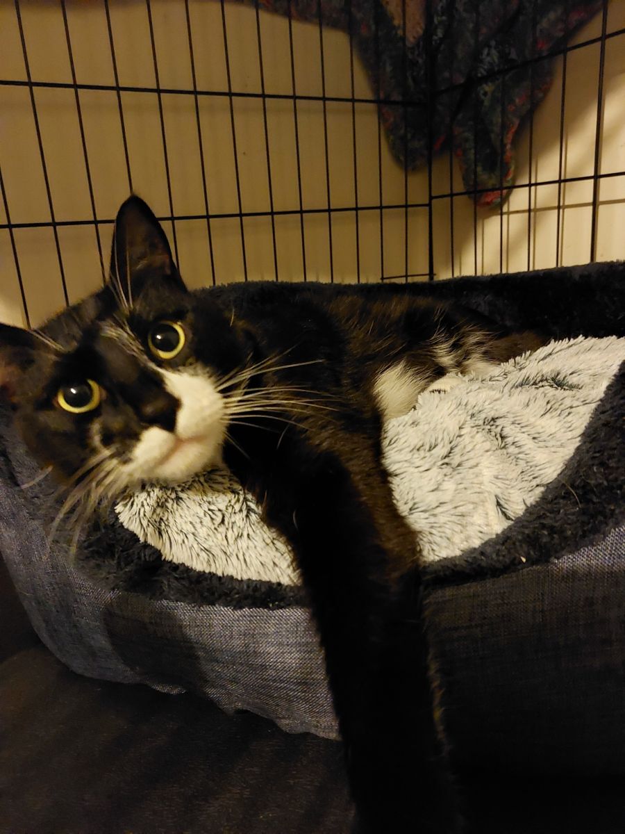 Felix has adjusted to his new circumstances well and is now out of his enclosure and free-rangeing in the room with the other cats.
