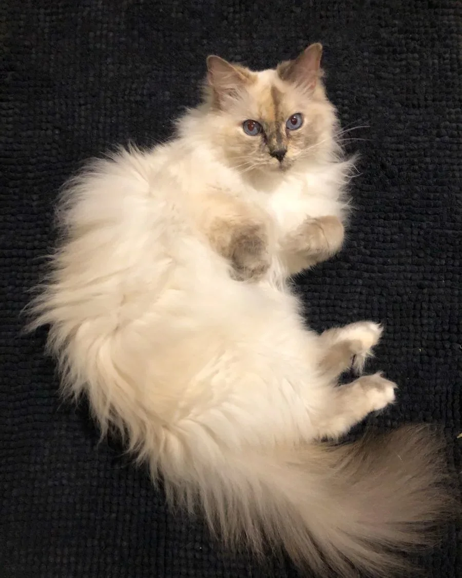 Meet our gentle, blue-eyed beauty, Nelly! This gal loves nothing more than being close to her humans. She may take a little time to settle on your lap, but she adores attention and will come running when it's time for a good brushing. And oh boy, does she adore belly rubs! Just watch her flop on her back, inviting you to gently rub her belly.