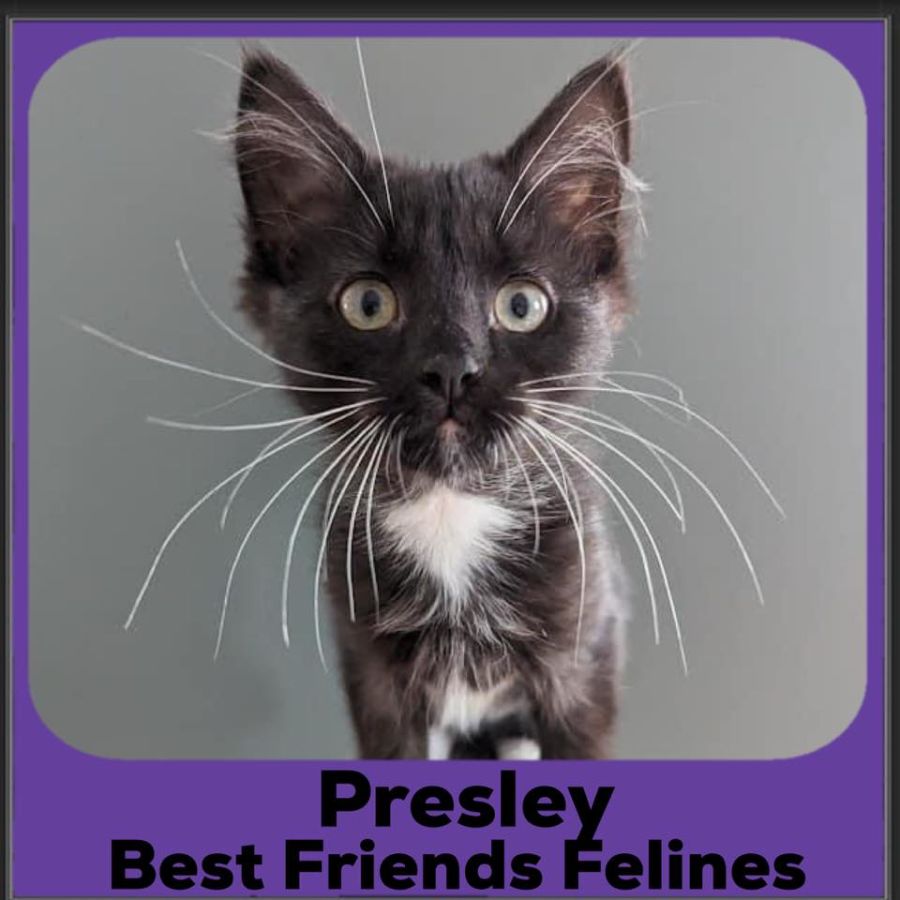 Presley is sweet, loving and adorable. He will greet you with lots of purry head bumps and body rubs with a little sassy butt wiggle, especially in the morning. There is nothing Presley likes better than sitting in his human's laps and having a snuggle or cuddling up with his kitty friends. Presley doesn't need to be the king of the castle, but rather be a great team player with his kitty siblings. With his lovely black and white coat and beautiful long white whiskers, Presley looks like a zoomy liquorice allsort when he's playful and feeling frisky.