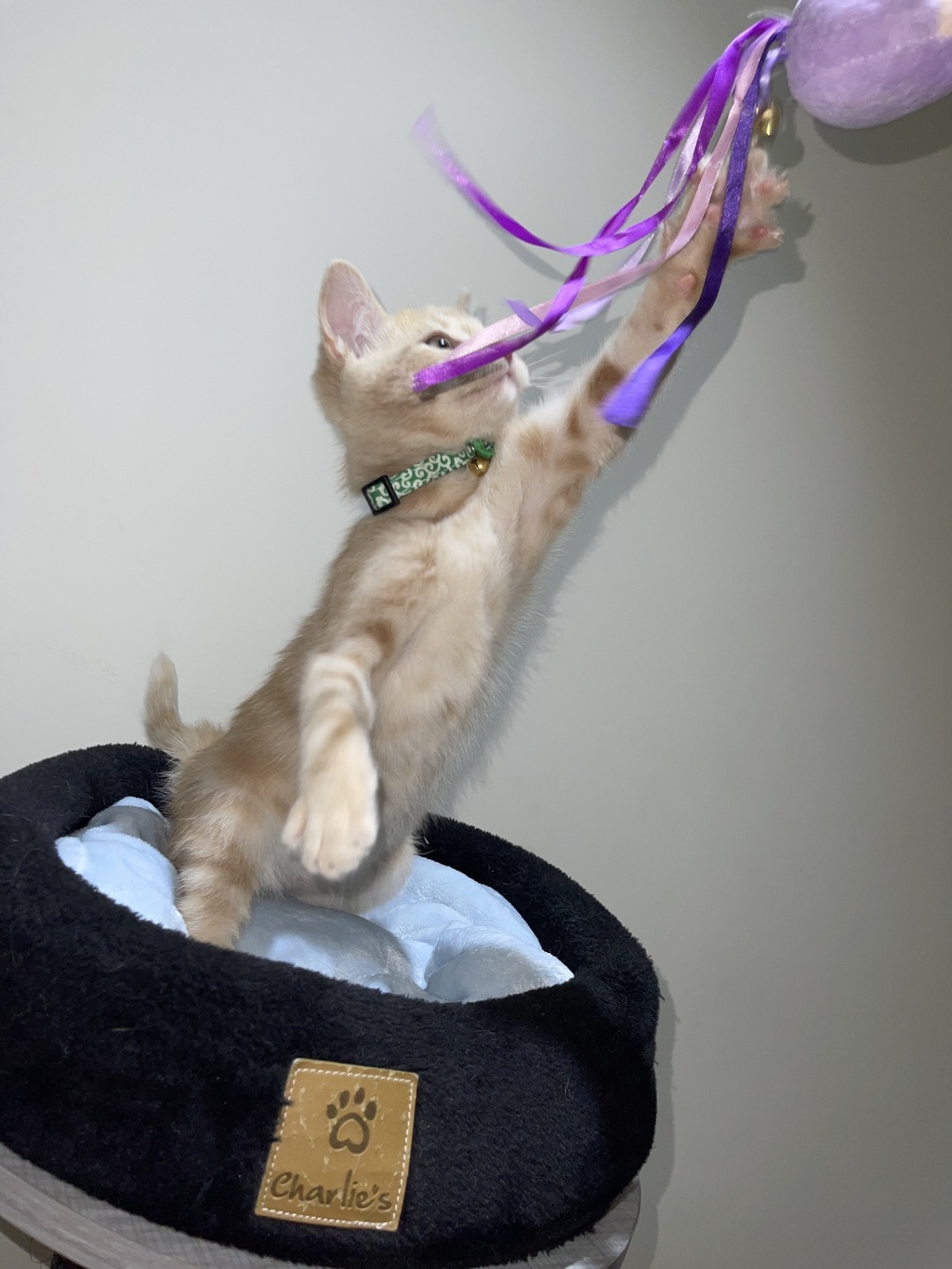 Looking for a puppy inside of a cat? Well Kenneth is just what you need he is the first to greet you when you enter the room and wants to always know where you are. Kenneth is curious, independent but your best friend. He will happily sit in your lap and enjoy all the chin scratches you can give or will play independently, but always popping his head around just to make sure your still there.