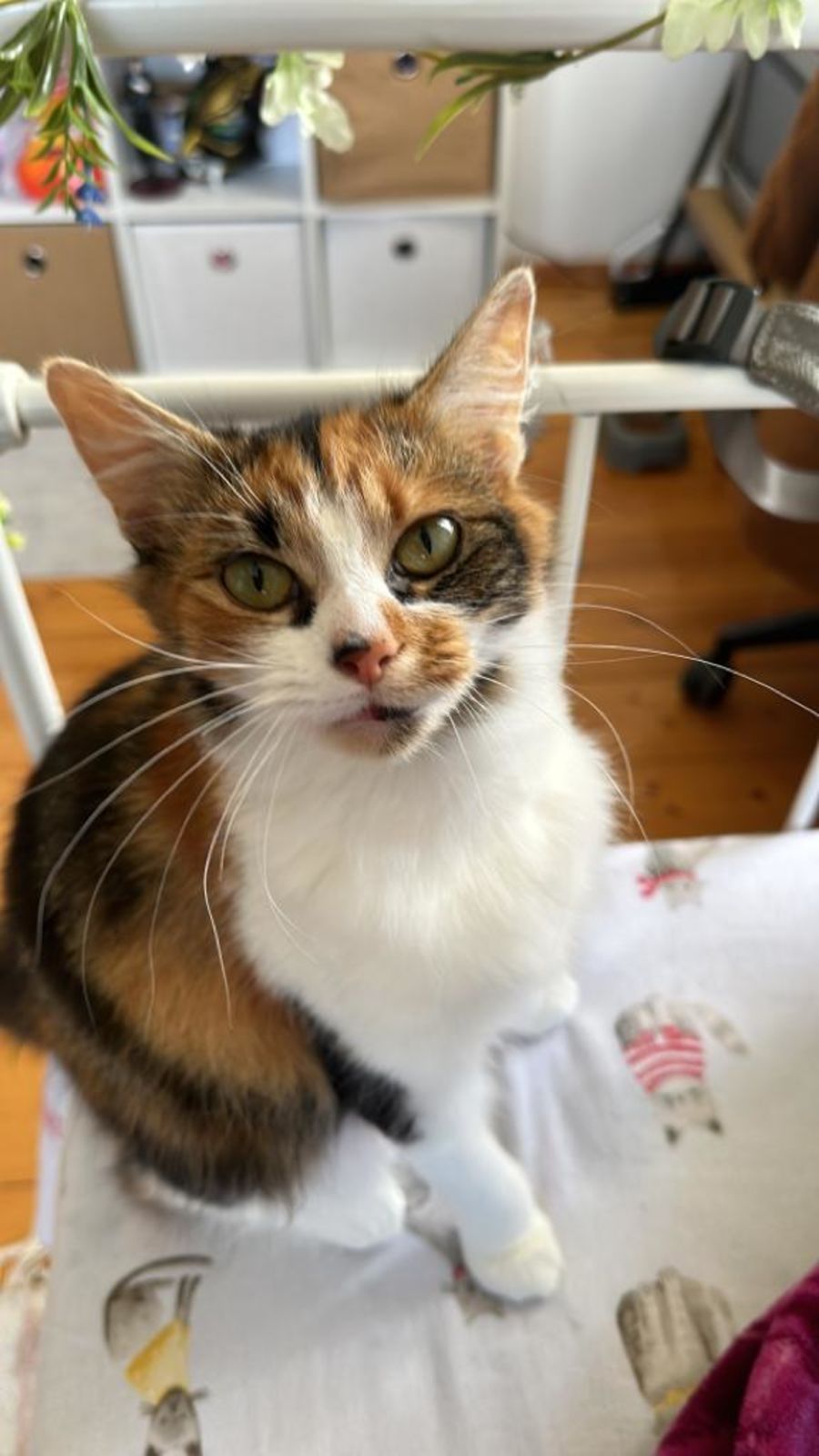 Amy is a sweet and playful calico cat looking for her forever home. She loves to keep company and is very talkative, often greeting people with happy meows and purrs with the minimum of touch.