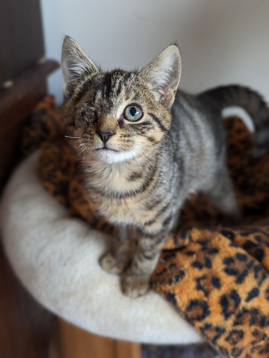 Truffle is absolutely fearless, she loves cats and dogs alike, she loves to climb her cat scratcher and she LOVES treats and food. Her field of vision and depth perception are (obviously, with only one eye) limited, so we are looking for a secure indoor only home for Truffle. A secure cat enclosure would be a big bonus, as Truffle loves to explore!