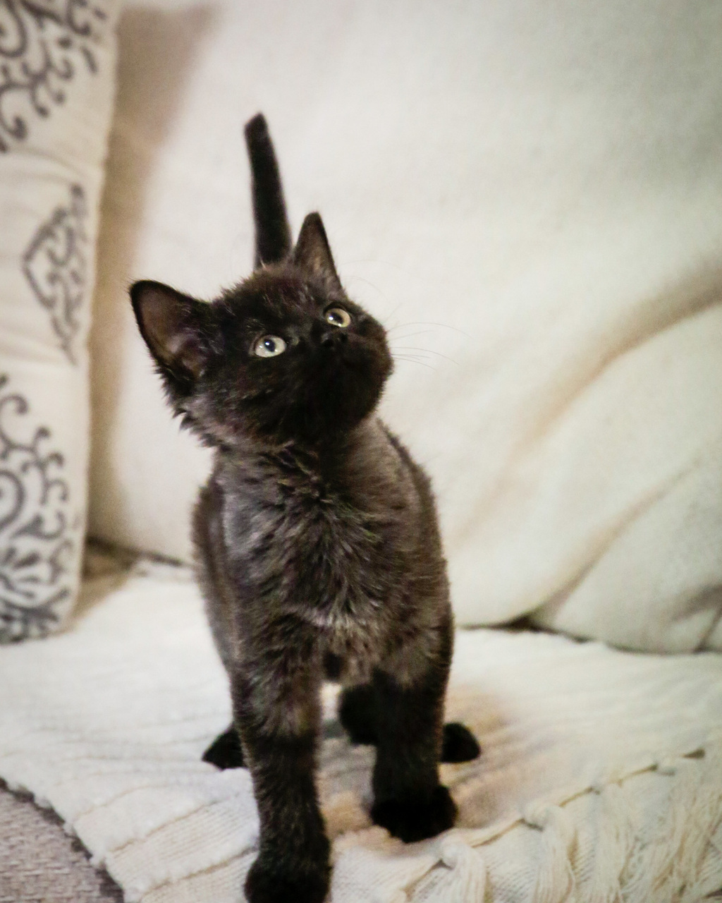 Dart is a very cute little fellow who has strangely decided to change colours. He came in as a beautiful black kitten but has over the last few weeks molted into a grey and black kitten. We do expect that he will eventually molt back to black again but it's a bit hard to guarantee his final colour.