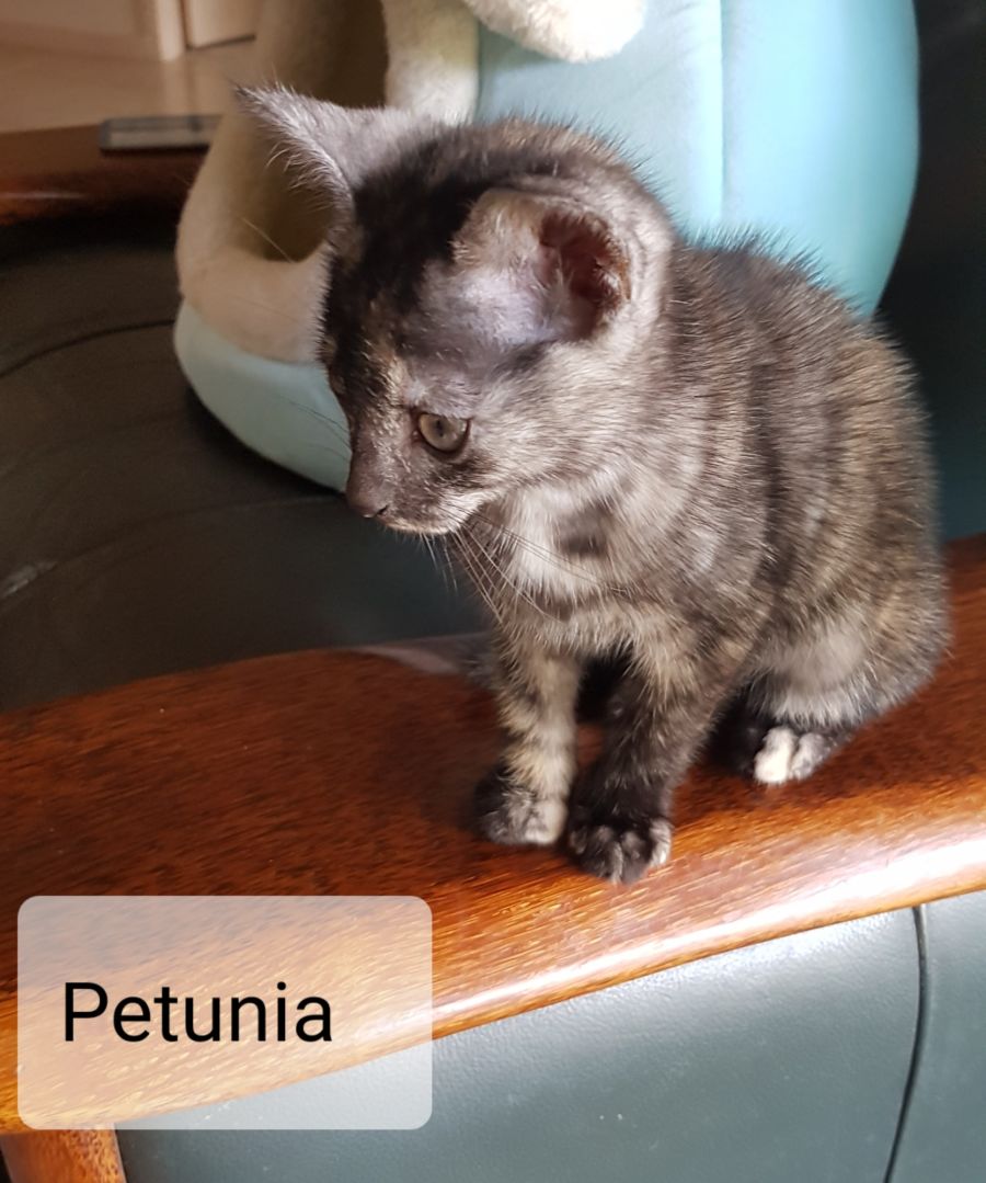 Petunia is a cute little torti/torbi. What she lacks in size she makes up with a voice at least twice her size.She is a very confident little girl, happy to play boisterous games with her male siblings and is respectful of the older cats in her Foster Home.