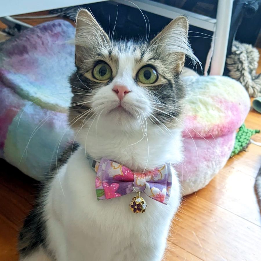 Pea is an absolute gem of a young lass. She's not had the most fear-free start to life but she's come so far in the time I've had her. Pea thrives with cat friends and loves a good play, she's almost always happy for a pat and may eventually become a lap cat. With her massive eyes she'll swallow the galaxy and her adopters whole world, luckily she isn't a huge foodie so keeping her off counters and out of bins isn't a problem. Pea loves room to explore and once she's comfortable she'll lounge around in open spaces, surveying her space from couches and cat beds. Get prepared for big zoomie's in the evening especially with her friends, she loves a good chase. Pea is mesmerized by wand toys and will leap to great heights and launch off furniture, making it a spectacle to watch.