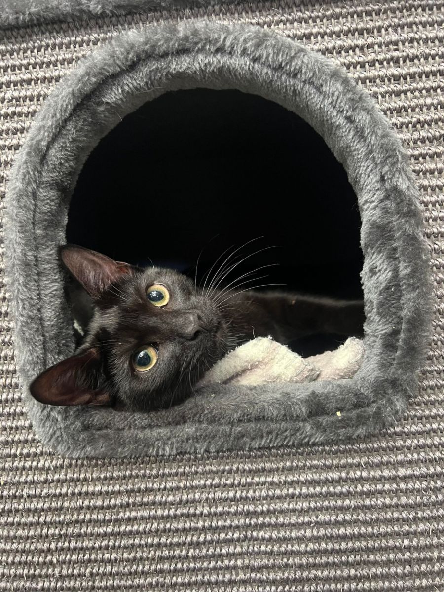 Velo is a handsome male cat who loves cuddling up on laps and playing with kids. His playful personality makes him the perfect pet for any family looking to adopt a furry companion. He adores children and will happily spend hours playing with them or simply lounging around while they read him stories. If you're looking for an affectionate feline who enjoys spending time with people, then look no further than Velo.