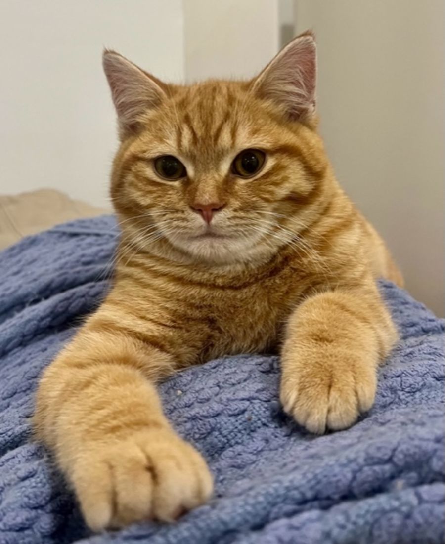 While George loves pats and likes to sit near his human, he prefers not to be picked up and most likely will not be a lap cat. He has a wonderful purr when relaxed and often snuggles up on the bed with his foster mama.