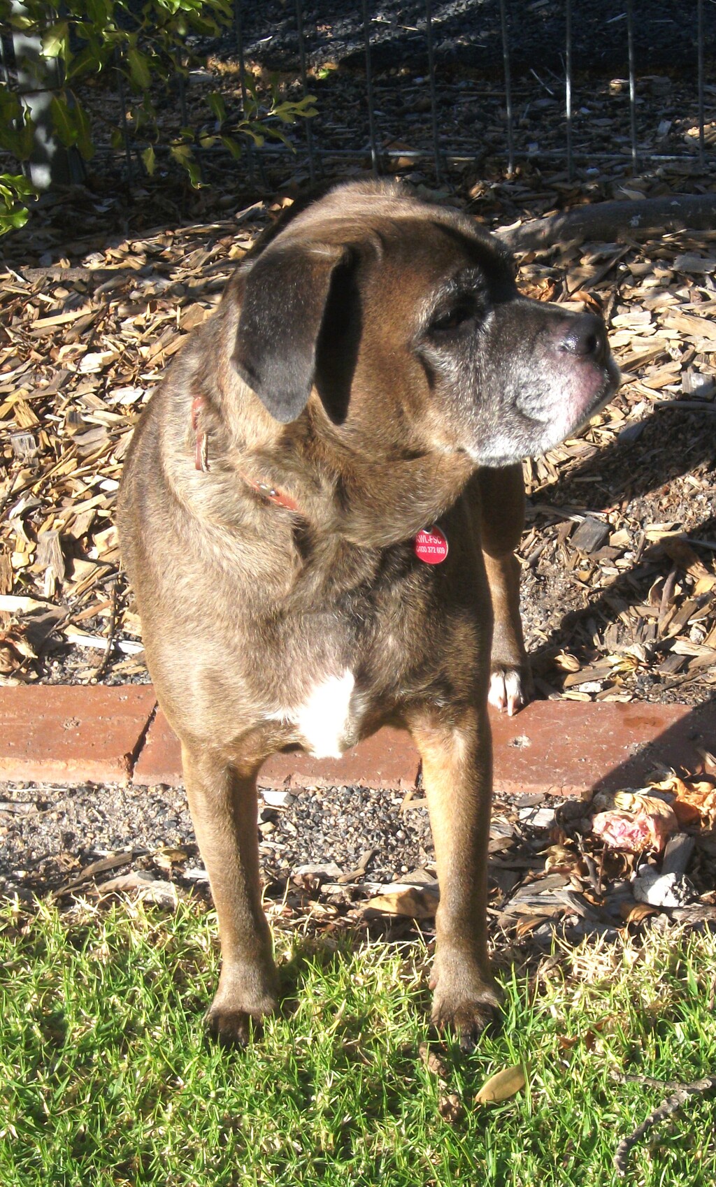 MYLO #2965 has been a loved family member and a very reluctant surrender due to the housing crisis. He is a gentle and reserved little fellow who has good manners. He's probably been a lap dog and snuggle buddy. Mylo enjoys his walks and although he doesn't pull on the lead he does like to go at a brisk pace. He is house trained and enjoys a little relaxation in the sun watching the world go by. Mylo likes to follow his human around, travels well in the car and at almost 6y he would make an ideal companion for an older person or couple who are active but home a lot or settled family. A quiet home would suit him best. Mylo is fine with other dogs but a little nervous if approached too quickly. He hasn't been heard to bark yet. He's 17.5Kg so he would benefit by losing a little weight. He's a brown Puggle [Pug/Beagle] with a grey muzzle which makes him look rather distinguished.