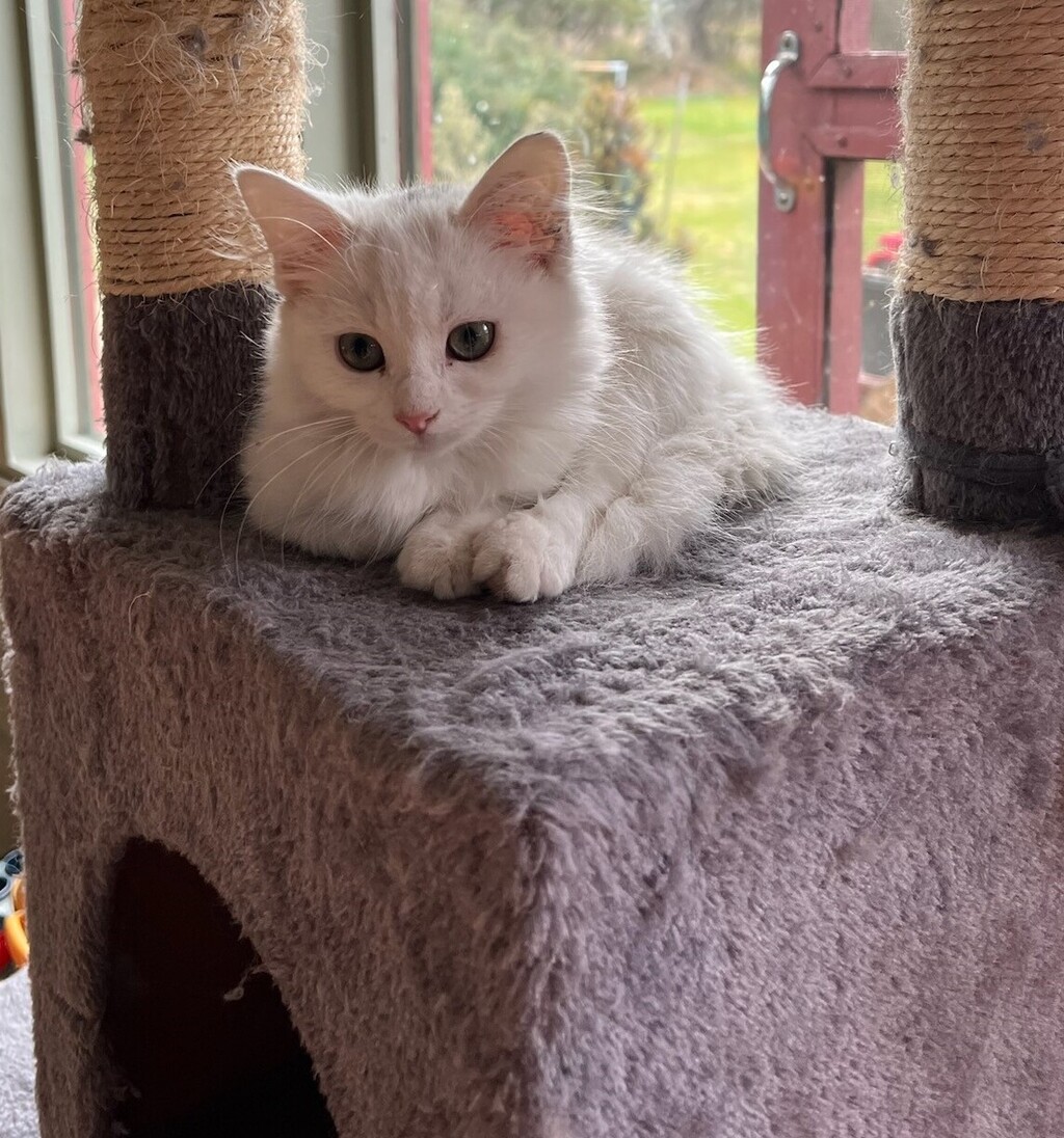 Looking for an indoor only kitten? With her white fur and pink skin she will need to be safe inside to save her from possible future skin cancers and that won't be a problem - she loves the safe indoor life.