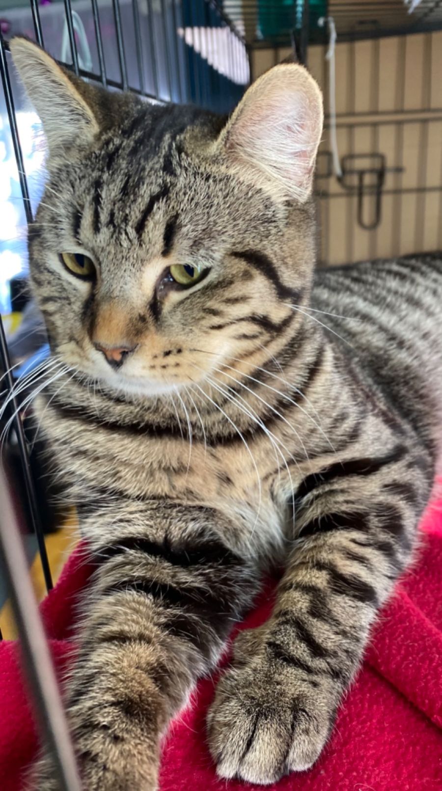 Mackie is a handsome young cat with an affectionate nature who loves nothing more than to be your best friend. He's an easy-going feline, and takes everything in his stride, which makes him great with young kids as long as they are gentle and respect his boundaries. Not only that, but he also gets along well with other cats - making him the perfect companion for any home. Mackie loves being around people and is sure to charm you with his beautiful personality. If you’re looking for a loyal and lovable companion, then Mackie is the perfect pet for you!