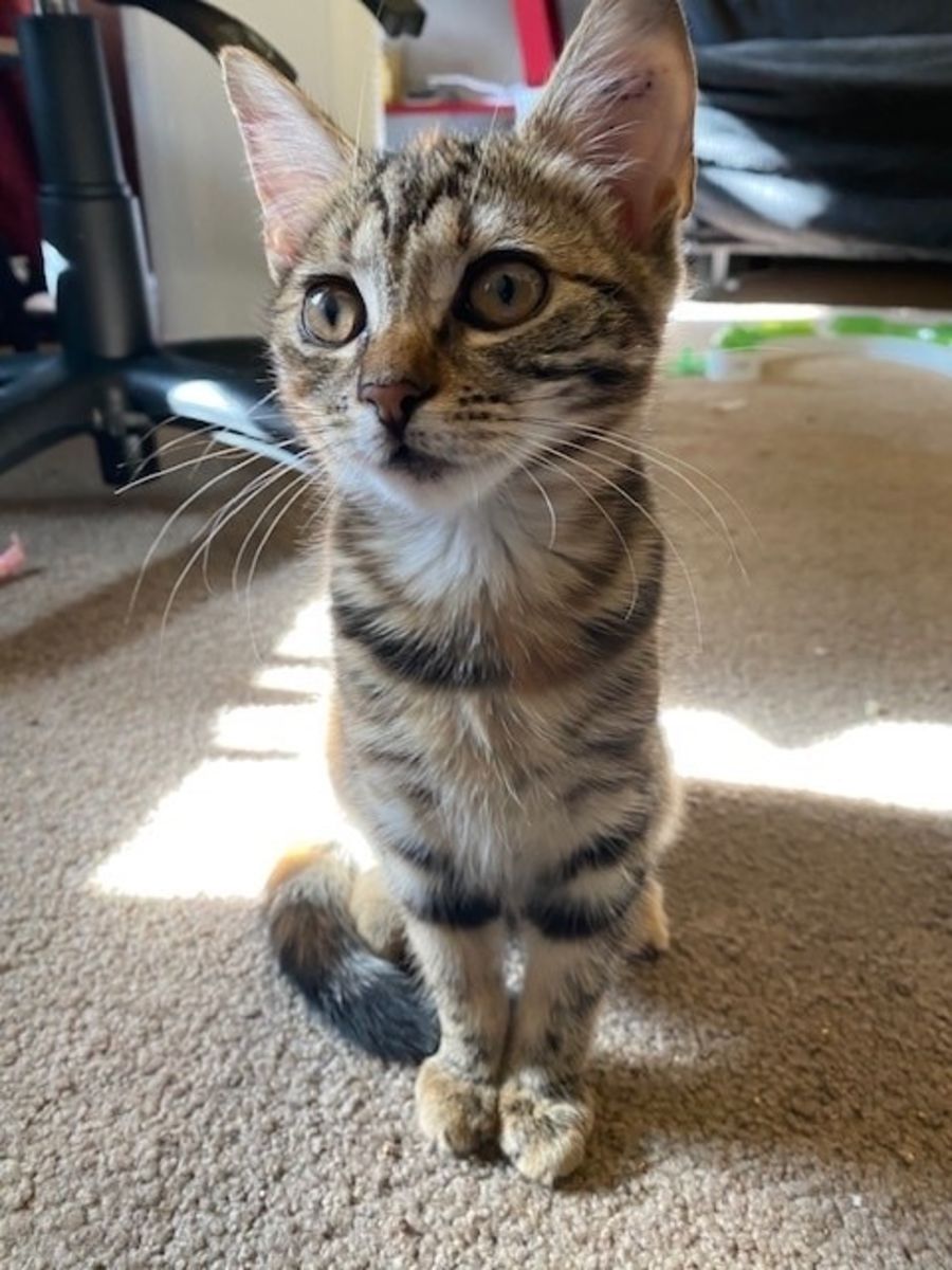 Meet Bindi, the sweet and friendly kitten with a heart of gold. While she may be more reserved compared to her outgoing siblings, she still adores playtime and will eagerly chase after balls with delight. Bindi enjoys her moments of tranquility too, happily dozing off or finding new heights to climb and explore. Her gentle and affectionate nature makes her a perfect companion for someone working from home, as she'll gladly provide companionship and comfort throughout the day.