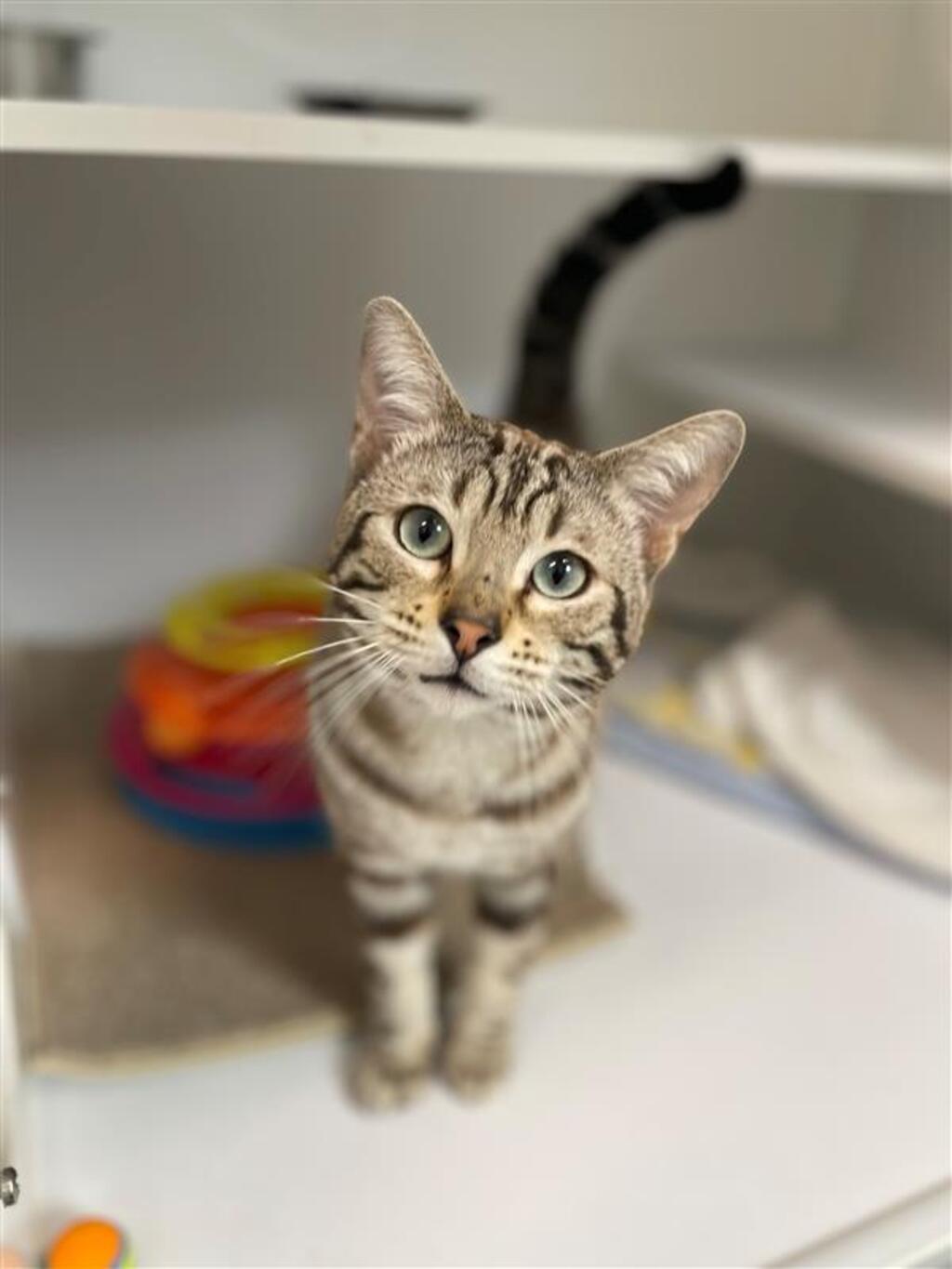Tiger can be shy at first, but all he is looking for is someone to love. Tiger is very snugly and sociable once they get to know you. Knowledge of Bengal behaviour is necessary before adopting tiger, since he is not your average cat. He loves to climb, needs daily play sessions, and may benefit from a secure outdoor cat enclosure. Tiger is best suited to a home with older children. Tiger is going to need a lot of enrichment and toys to play with. Tiger will also befit from a lot of solid scratching posts and climbing spaces. If you can keep up with this intelligent and playful man, please enquire at RSPCA Peninsula or call 5978 9001!