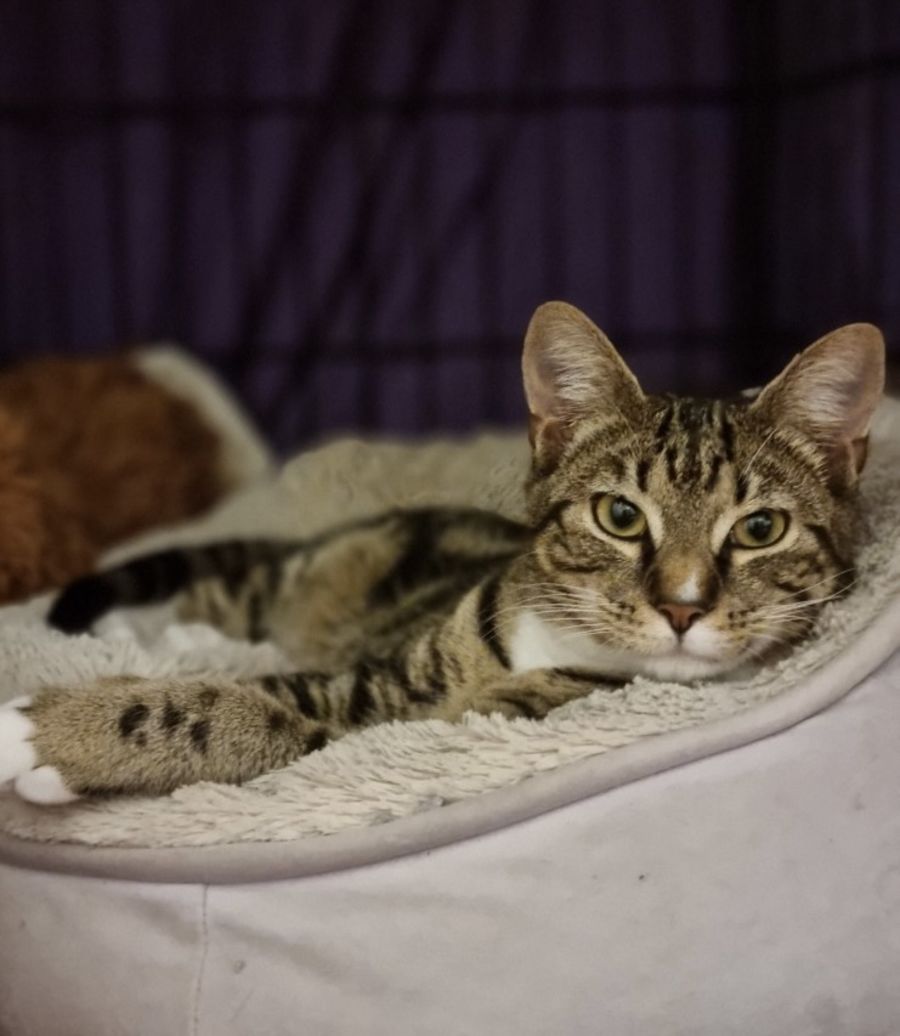 His foster carer Carley has done an amazing job of bringing out his big personality, from a scared very vocal little boy, to a confident, loving and playful cat who loves people. He still has his timid moments, but loves pats and sleeping at your feet in bed.