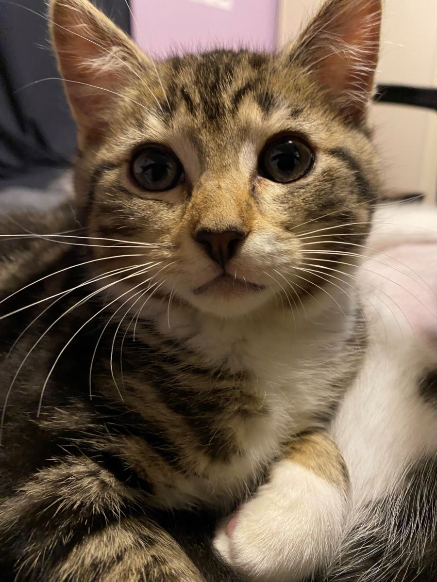Howl didn't get his name because he's noisy. Like his siblings, he was named after characters from Studio Ghibli movies. Like the Howl in the movie Howl's Moving Castle, Howl is a suave, handsome guy. He thinks he's a bit of a tough guy, but really he's a big softie. Once he gets to know you, he'll come up for a cuddle and purr and purr.