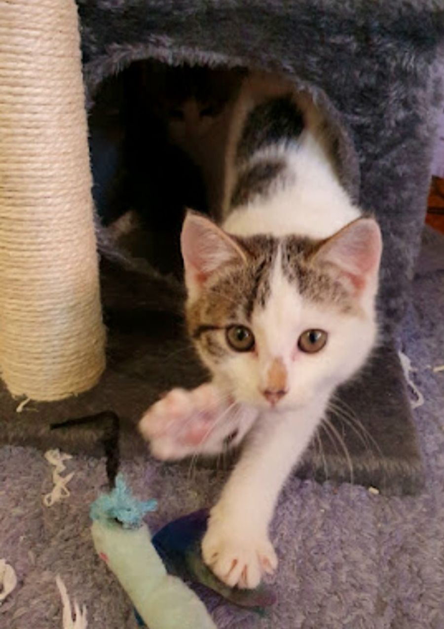 Meet Pickles, the purring machine! This delightful female kitten is as sweet and loving as can be. She loves to snuggle up with other cats and get affection from her humans. With a soft and gentle demeanor, Pickles is always ready for playtime. Whether it's chasing around a toy or just cuddling in your lap, she will bring you an abundance of joy.