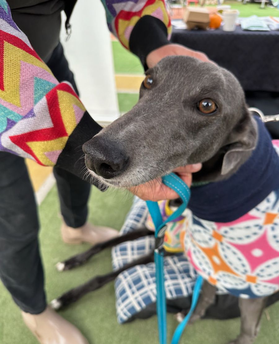 Juliet is happy with a 30 minute walk early in the day and another shorter walk in the evening before heading to bed. Out and about she walks well on lead and is happy to take in the sights and smells. She isn’t too bothered by traffic or busy footpaths. Juliette is polite with other dogs she meets, preferring to spend time with calmer dogs like her and prefers to just walk by the more excitable jumpy ones. Of course, Juliette will make sure she greets every greyhound she can spot in the neighbourhood.