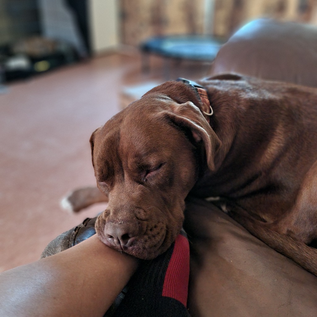 He's a big, sweet, loving boy who loves to curl up on his bed or at your feet, going for walks and playing chasey with his fellow foster dogs, he's toilet trained and has just learnt how to use a dog door, he sleeps inside on his bed besides his carer's bed at night.