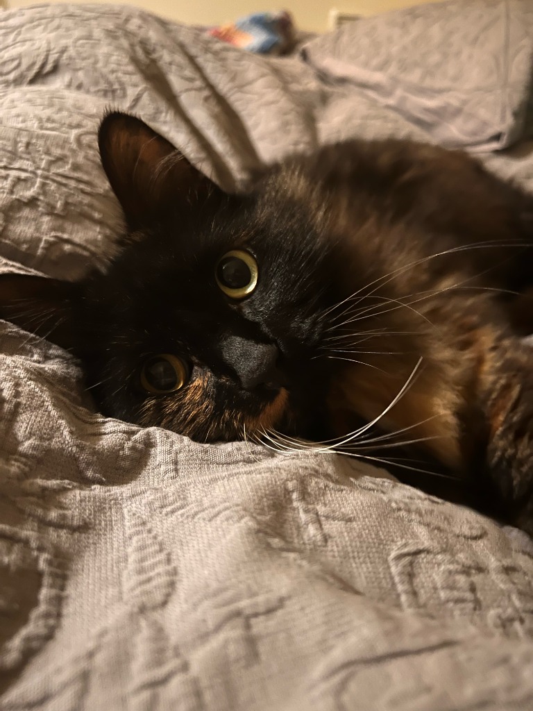 Delilah is a domestic medium haired female cat who is predominantly black with caramel markings all over, and a beautiful long floofy tail.