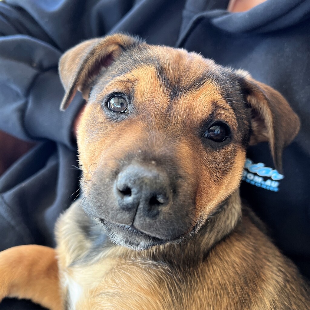 AUDREY #2971 is 10 weeks old and looking for a place to call home. This gorgeous, snuggly girl is an English Staffie cross kelpie and will grow into a medium sized dog. She is very social, loves people and other dogs and is learning to respect the chooks. She has lovely markings on her face and has earned the nickname Frida due to her monobrow! Audrey's adoption fee will cover her desexing, microchip, 2x vaccination, worm/flea treatment and vet check.