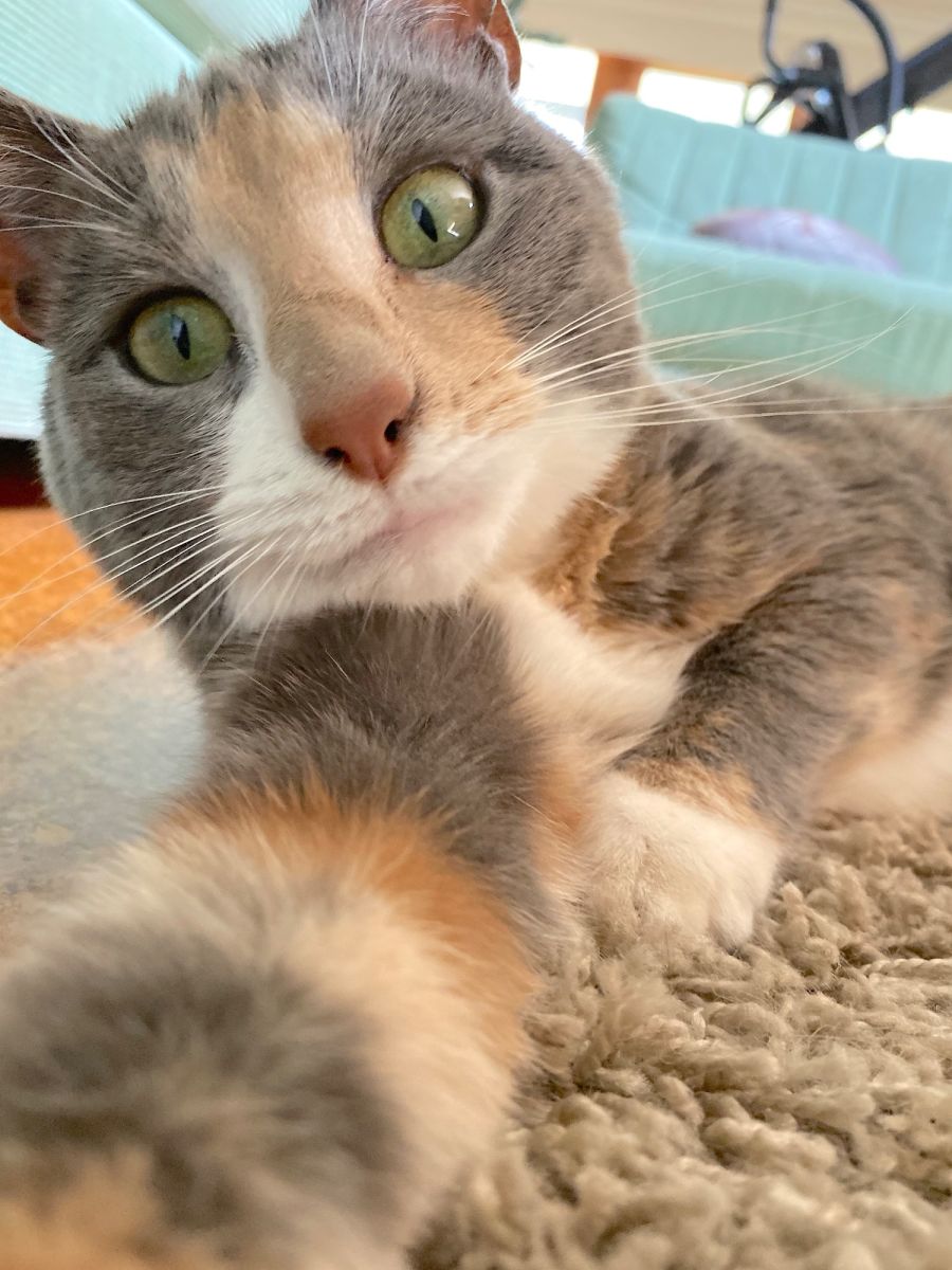 She's famous for giving quite strong headbutts to signal she wants affection. Muffin also does a 'duck and roll' where she'll push her head against you and then do a somersault so she rolls onto her back, hoping to get belly rubs. Gentle and loving, she'll push her little head against you or rub you in request for pets.
