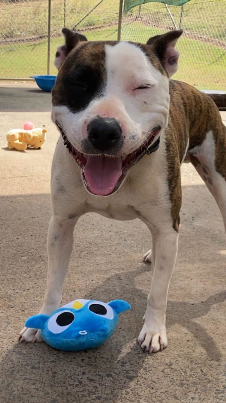 IMP 172 LITTLE BRUCE. Brindle and White Male English Staffy, 2.5 years old. Little Bruce is a happy little staffy with so much potential and love to give. He was originally surrendered in August 2023 due to incompatibility with another dog in the home. He was adopted pretty quickly and went to live with another female staffy. Unfortunately, he was returned after a month. Whilst he does like to play with other dogs the biggest issue is that in the home he has jealously and resource guarding issues. We have not seen these issues in the Shelter and have tested him again with other dogs. He is now best friends (and almost lovers) with a male large dog HERCULES. He is crate trained, house trained, very clean, quiet and walks well on lead. Initially he can be jumpy and mouthy but does settle well. He is great with children. He has been microchipped, registered, desexed, vaccinated, wormed and flea treated. He is looking for a committed, experienced home. His adoption fee is $408. Please call 65833488 or come for a visit. Alternatively, if a rescue group would like to take him on or someone arranged for a foster to adopt (through a rescue group) we are open to those options.