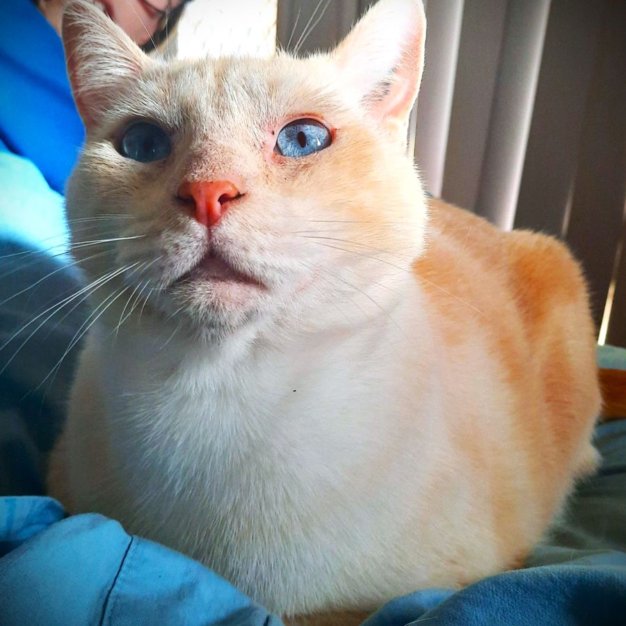 I am a very social, happy and snuggly boy with the most beautiful blue eyes you've ever seen! I came to the rescue when my owner had to move home short notice and couldn't find anywhere they could take me with. It was a hard choice for them because I am such a great cat! I am beautiful with the human kids here, as well as the other cats, and even the dog!