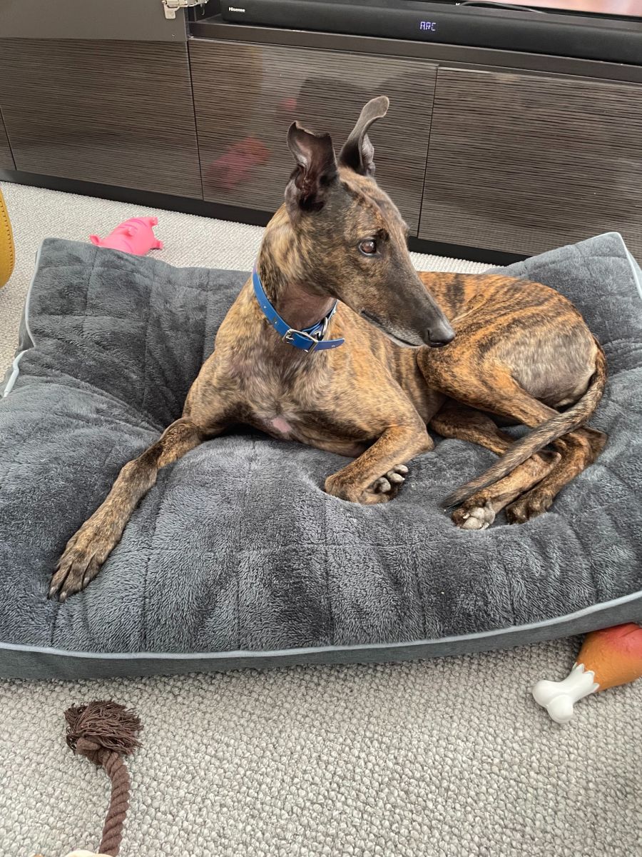 He would be suited to almost any housing situation so long as he gets plenty of walkies and ideally, he has a human at home most of the time to keep him company. He will need to remain on his lead at all times while out as he doesn’t have a solid recall and being a greyhound can zoom off in a flash. I would recommend avoiding dog parks in the early days of him adjusting to his new family and to avoid him getting too overwhelmed.