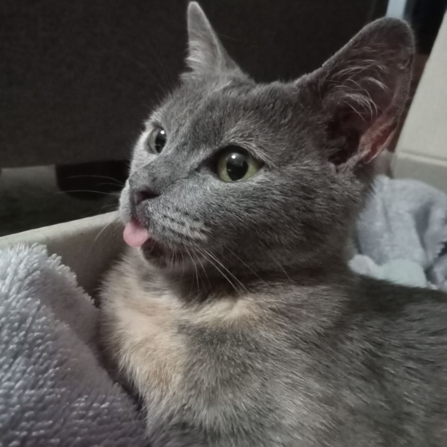 Ashley is a silver tortoiseshell. She is such a quirky girl, very chatty and both her and her sister are clever kittens. Ashely will run to the room she is fed in at mealtimes and wait which is not something I see with the other cats, they are a lot more chaotic when the food comes out. Ashley is very affectionate and loves to co sleep with her foster family or with her sister in their cat bed. She is very fast and loves to play with the laser or play chase with her sibling, Daisy. Ashley has a habit of leaving her tongue out which is very cute. She is the perfect girl and would suit a home with gentle children or anyone that has time to hang out with her because after being in a busy house with lots of cats and people she will need company. Ashley has 1 sister so why not consider a dual adoption to keep them together.
