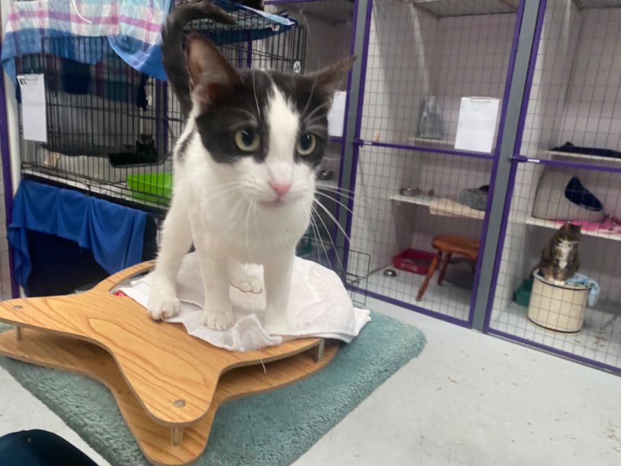 She was rescued from a pound after recently having a litter of kittens. She is a sweet cat that enjoys pats and as she's still young likes to play and explore too.