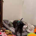 He has three big toy boxes to choose from, each full of some flush squeaky toys and things to chew and throw. He will also drag his beloved cuddlepilla to different rooms.
