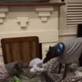 Olaf is in foster care with a young female and male greyhound. He and Whisper, his foster sister love to play together. They gallop the length of the house and have a great time tossing toys and having a playful wrangle. Whisper and Olaf love to play tug-o-war. Often the smaller Whisper wins as Olaf decides to “Let it go” (sorry - bad Frozen pun)