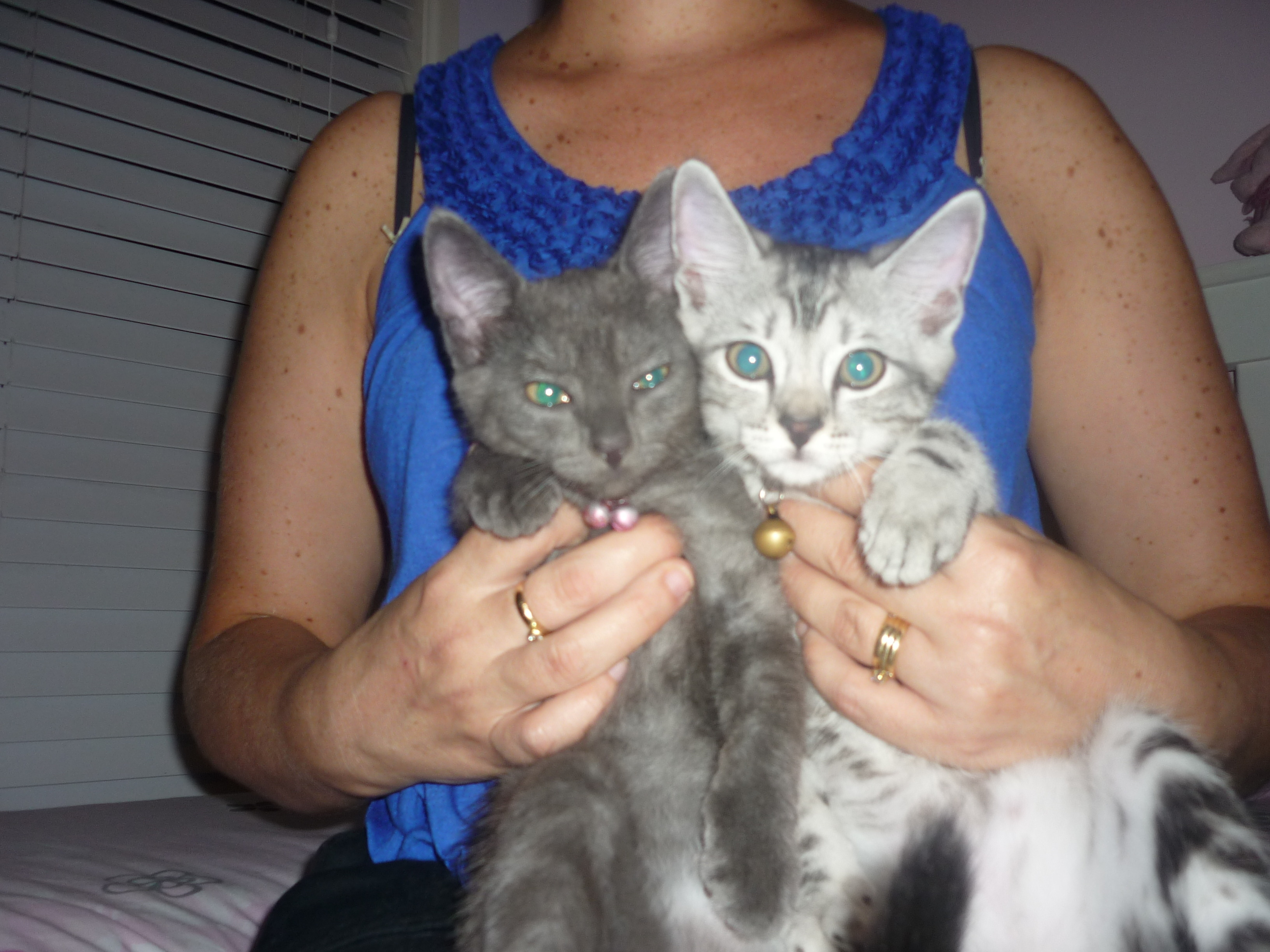 Hello. Our names are lilly (silver) and tiger (tabby). We are approx 8 weeks old and just love people and cuddles. We were lucky enough to be rescued when abandoned in a box in a toilet block in a park. We are very good friends and would like to be homed together if possible. Everyone tells us we are absolutely stunning with unique markings and pretty faces. Contact simone connors 0423835523 anytime