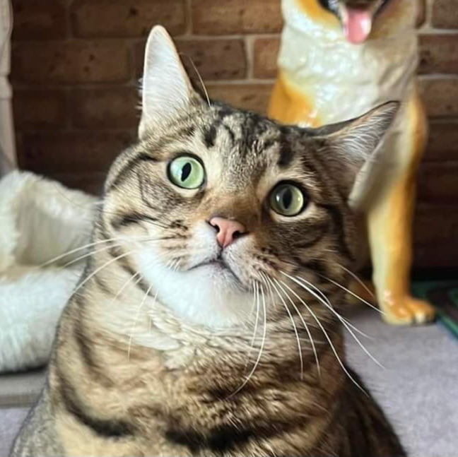 From day one in care this chunky sweetheart has wanted love and cuddles, and to curl up next to you. He would also like to cuddle on top of you but since he's 8.5kg you there's a possibility you would suffocate if you let him! This beautiful boy may be big but his meows are as tiny as a kitten's! 🥹