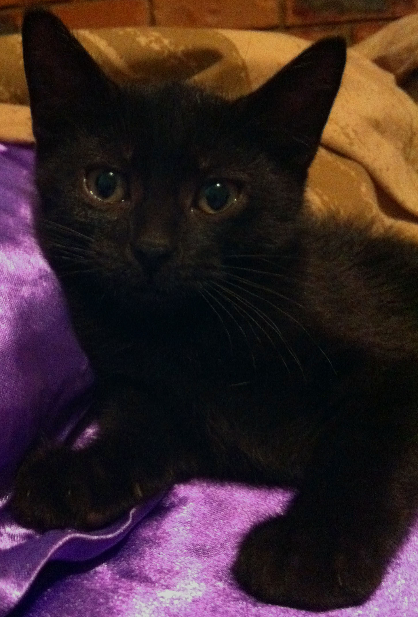 I’m katrine and i’m the independent one. I love playing with my siblings but love having time on my own as well. I’m an 8 week old female black short hair kitten. I’m quiet and placid, most of the time anyway, and am sometimes easily scared. I may be the smallest of my siblings but can handle myself when they gang up on me. My sister, kalush, may be the explorer but i’m the one who figures things out first. Like how to climb the exposed brick wall to get up on the desk where mum is. I’ve seen my foster parent’s husky but i am not bothered unless he gets to close and then i run away. I get along great with my mum and siblings but haven’t really met any other cats. I have had limited exposure to children. My perfect forever home will be one with parents who love me and play with me but will also respect my need for space. If you want to meet me and see if you’re the perfect humans for me please contact my foster carers