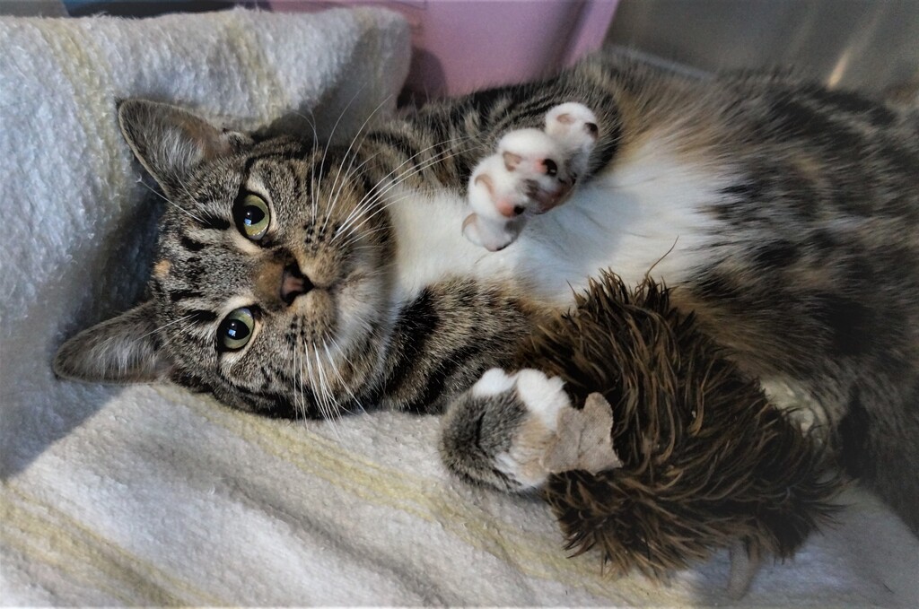 Hello, my name is Kiwi! I am a beautiful tabby torti & white female cat eagerly searching for a loving new home.