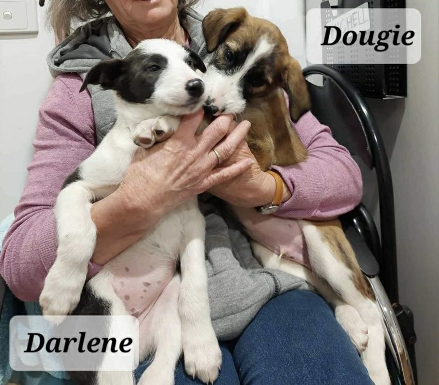 Meet Darlene and Dougie, 10 week old, staghound x border collie x kelpie pups. This beautiful pair are settling well into home life and coming out of their shells well. Dougie is definitely the more cuddly of the two, whereas Darlene will happily keep to herself and can be a bit timid at times. Both sleep inside in a crate, but love being outdoors during the day. They are typical staghounds when it comes to appetite and only eat what they feel like. They sit for dinner and are about 80 percent there with house training.