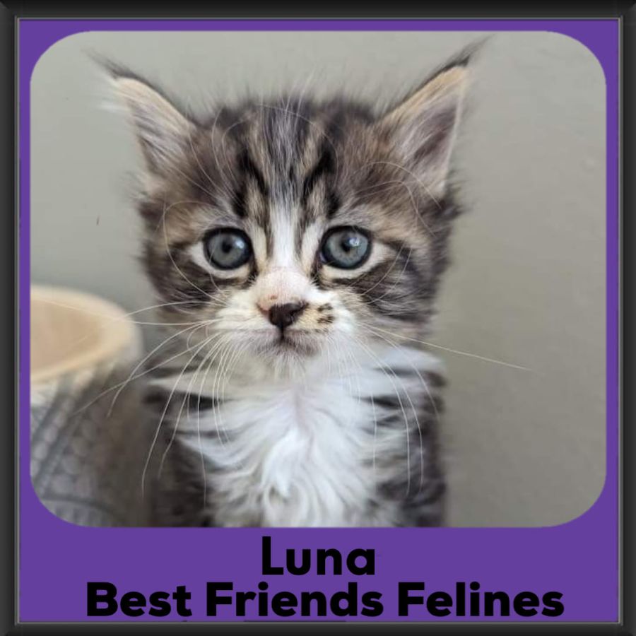Hi my name is Luna and I'm a beautiful fluffy tabby with a white nose. I have 3 crazy siblings, and I'm the smallest and quietest of them.