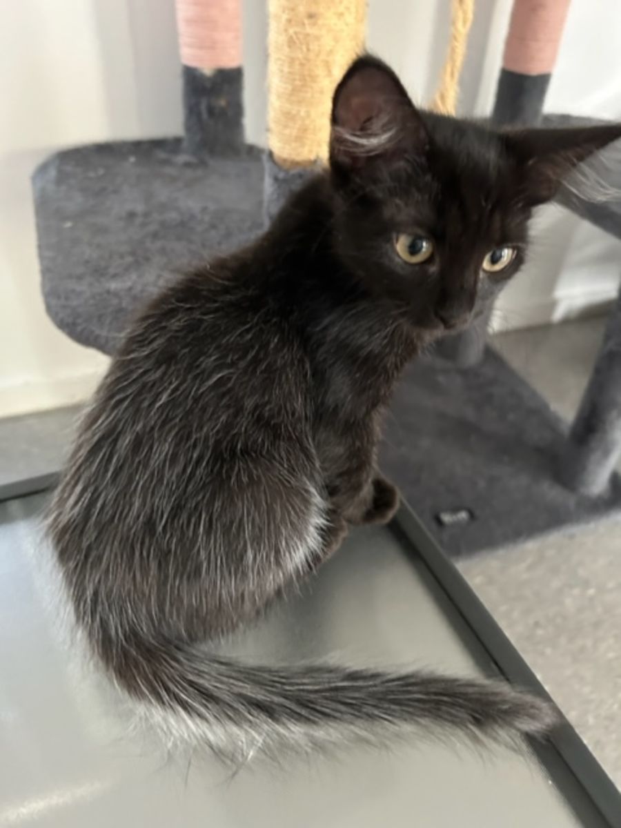 Splash is a female kitten with splashes of silver in her black fur, making her stand out from the rest of her litter. Despite being the runt of the litter, Splash is not easily intimidated. She prefers to sit back and assess any situation before taking action. If you're looking for an affectionate cat with a unique look, Splash is the perfect pet for you!