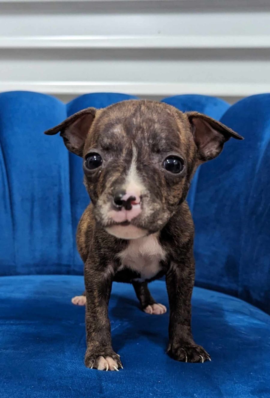 Introducing the cutie Savannah! Savannah is a Staffy x born on 3rd July 2023. Please note that Savannah is the runt of the litter & is half the size of her siblings.