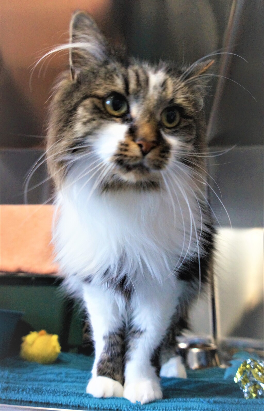 My coat is a stunning combination of tabby and white, which perfectly complements my charming personality. With my bright eyes and welcoming purring, I have the ability to make anyone feel instantly at ease in my presence.