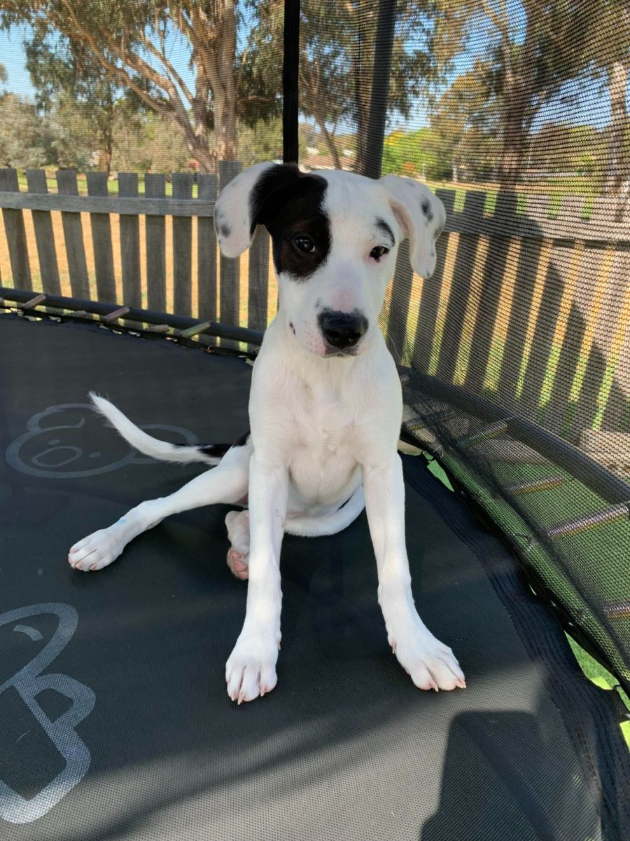 Coco has beautiful soft fur and unique markings including a black eye patch and opposing eyebrow. She loves to play with her siblings, our resident dog and our children. She particularly fond of the trampoline and likes to play tug. Like all puppies she will require further socialisation and training to become her best self. Coco is looking for a warm indoor bed and plenty of adventures with her family to be.