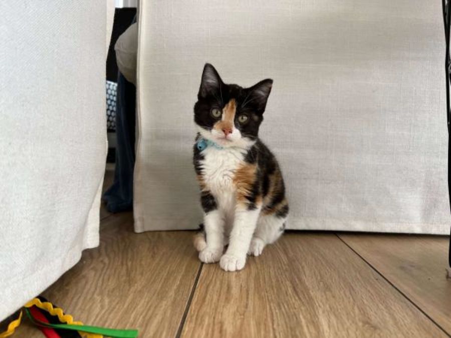 Sabine is a beautiful calico kitten who is curious, quiet and affectionate (once she knows you). She came under DCH care with her sister (Lucy). They were both malnourished. However, after a few weeks of good, regular kitten food and plenty of cuddles from their DCH foster carer, they have both thrived, with no lasting effects from their initial malnourishment.