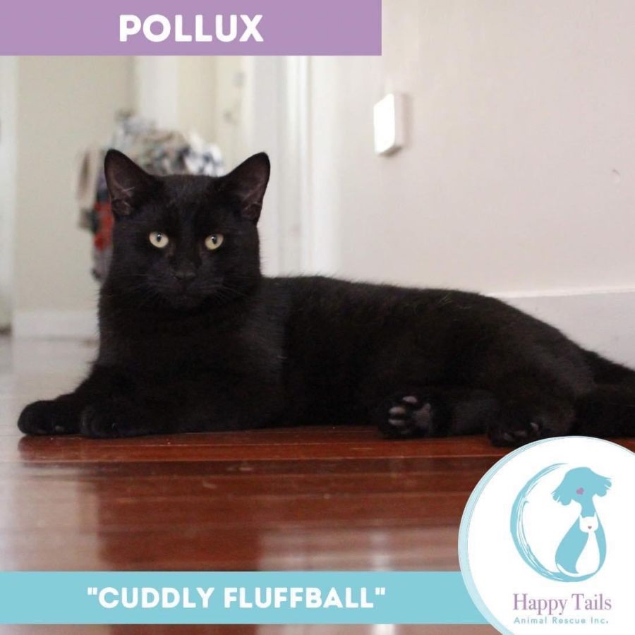 Pollux has adorable little white spots (like freckles!) on his back, which look like little stars in the night sky against his soft black fur. He's happy to be carried around, and has the biggest purr of his brothers. He also loves food the most, but is great at sharing.