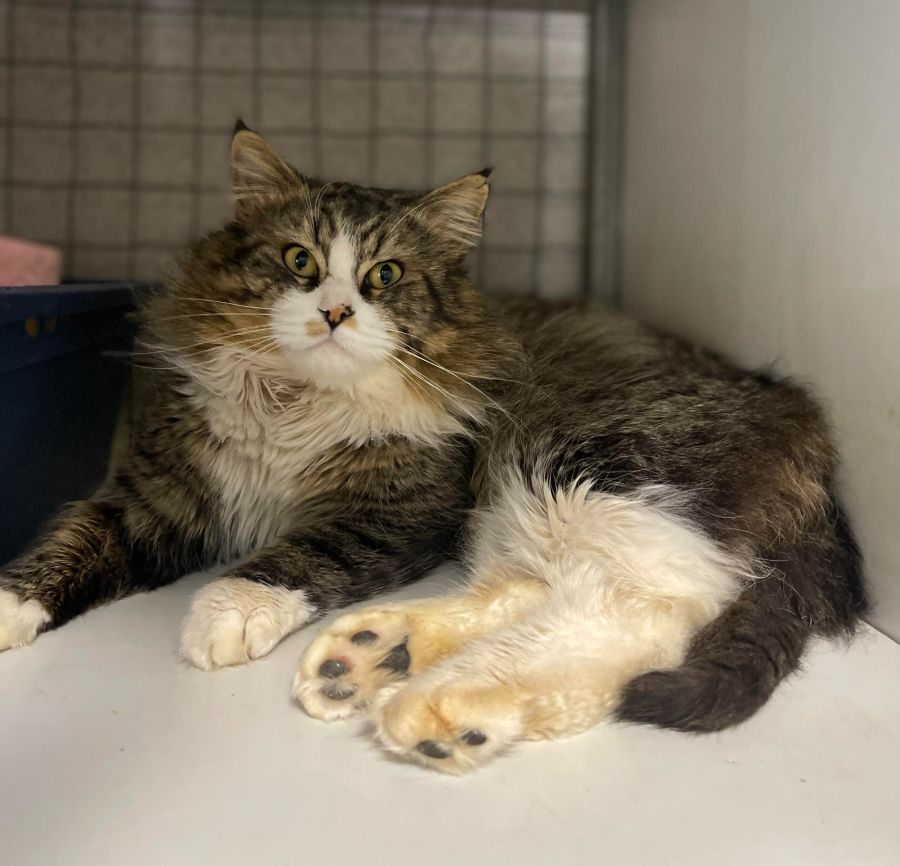IMP 125 LEON. Leon is a male long haired tabby and white cat, aged between 5-10 years old. He came in as an undesexed, unmicrochipped stray cat. We had people comment that he was abandoned and had been unowned for some time. In the Shelter, he has been a really lovely cat, happy to be handled and easily microchipped. He was obviously owned at some point but clearly lived an outside life. He does have that undesexed male smell but is clean in his litter tray and doesn't spray. He is being desexed on Monday 11 September so that will clear up some of the smell. He does not seek the outside or try to escape. He is the typical cat that would be harder to rehome due to being undesexed for so long but he is a truly lovely cat. He would suit a shed, garage, barn, stables or given time an inside life. His adoption fee is $204 which includes microchipping, registration, desexing, vaccination, worming, flea treatment, litter tray and bed if required. If you can't adopt you may wish to donate to his adoption fee which will assist someone who can take him in. Thankyou